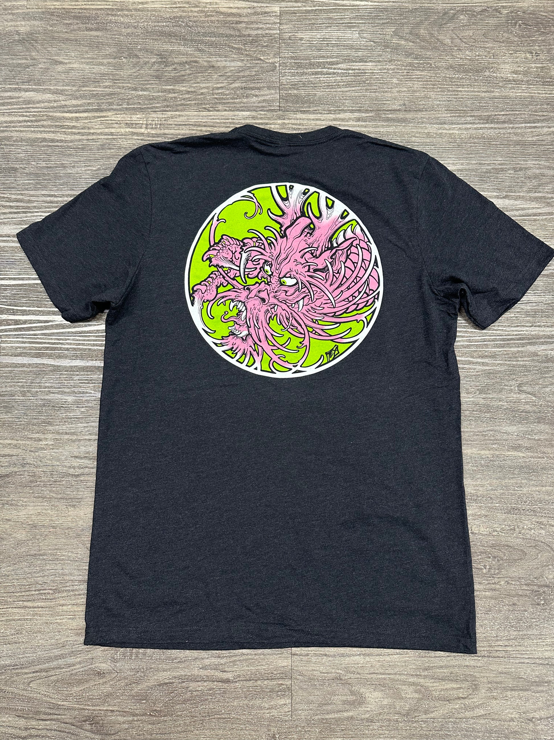 Premium quality, pre-shrunk Grey Unisex Triblend tee with a Pink and Green Dragon designed by James Tex.